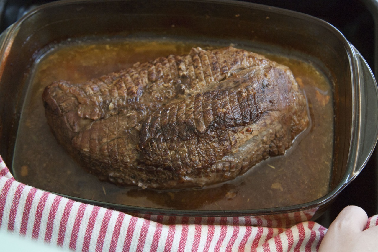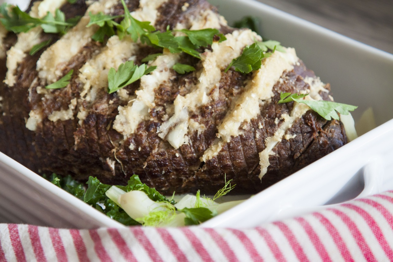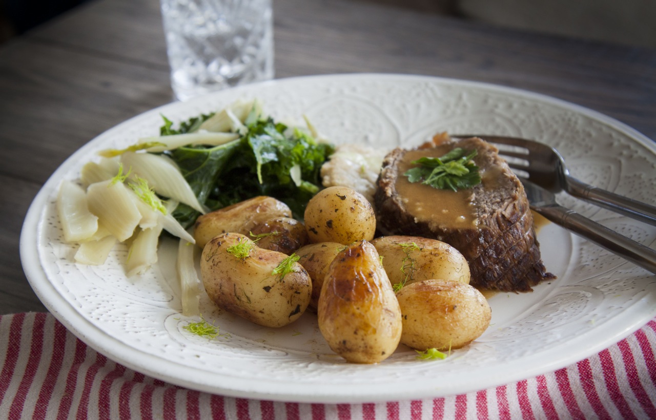 Przed wojną taką pieczeń podawano zapewne na oddzielnym półmisku a biesiadnicy wybierać mogli w bogatym repertuarze dodatków i garnitur z jarzyn. Moi biesiadnicy w tym zakresie niestety zostali nieco pokrzywdzeni i zadowolić musieli się wybranymi przeze mnie odgórnie dodatkami. Dostali więc młode ziemniaczki, duszone bulwy kopru włoskiego i jarmuż. Nikt z tego powodu jednak specjalnych sprzeciwów nie zgłaszał a skoro doczekałam się nawet pochwał i dokładek – nie mogę nie podać tego przepisu i pod Waszą rozwagę na dni gdy czasu na gotowanie mamy nieco więcej. Nie ma co przecież mydlić sobie oczu – upieczenie 2-kilogramowej pieczeni wołowej zajmie nam nieco dłużej niż usmażenie kotleta ale jednocześnie pamiętać trzeba, że nie jest to przecież czas spędzony na nieustającym sterczeniu w kuchni! Tak naprawdę jeśli na obiedzie spodziewamy się większej liczby gości, przygotowanie takiej właśnie pokaźnych rozmiarów pieczeni, która w piecu robi się praktycznie sama z okazjonalną tylko naszą ingerencją – tak naprawdę pozwoli nam ten czas zaoszczędzić i na przykład skupić na dodatkach do obiadu czy, co ważniejsze – deserach! Jej przygotowanie można też tak naprawdę podzielić na dwa a nawet trzy dni co dodatkowo dobrze wpłynie na smak i kruchość mięsa. Jako, że wołowina sama w sobie jest mięsem bogatym i sytym jest również wysoce prawdopodobne, że pieczeń zostanie Wam również na następny dzień.